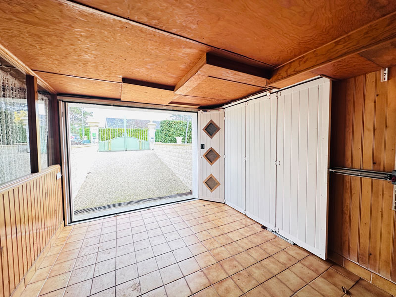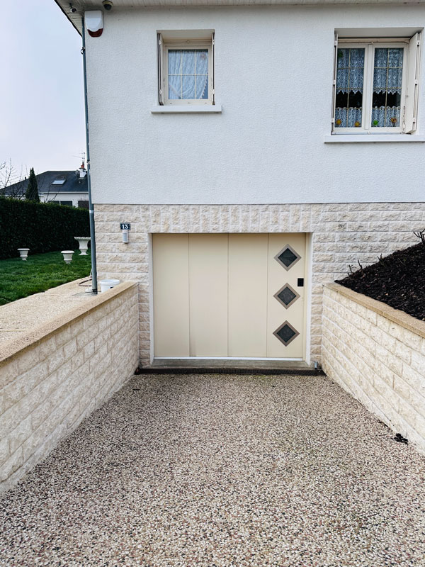 Rénovation avec l’installation d’une porte de garage motorisée avec ouverture latérale, composée de hublots avec double vitrage retardateur d’effraction.
