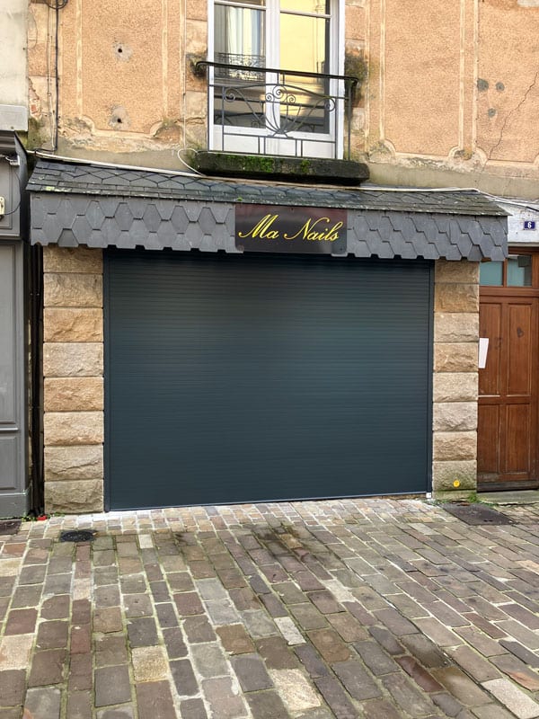 Remplacement d’une grille de sécurité d’un commerce par un volet roulant électrique en aluminium renforcé.