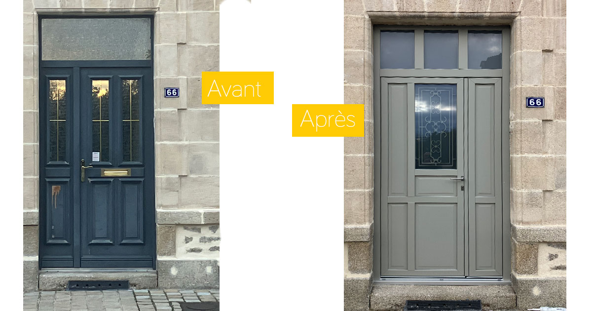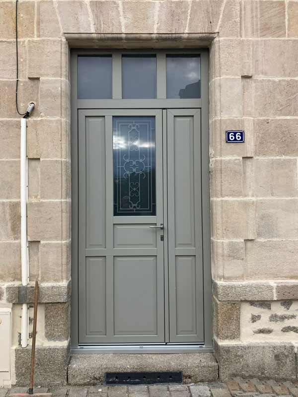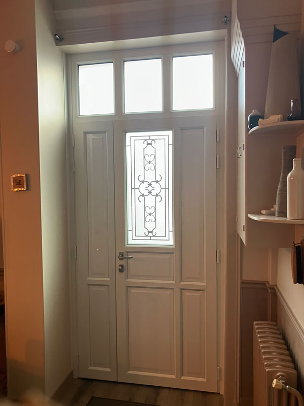 Conception, fabrication et pose d’une porte d’entrée PVC composée d’un triple vitrage avec grille décorative incorporée.