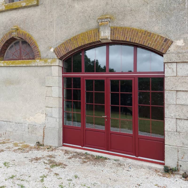 Rénovation d’un annexe du château de Coulonges-sur-Sarthe avec des menuiseries en PVC plaxé rouge veiné.