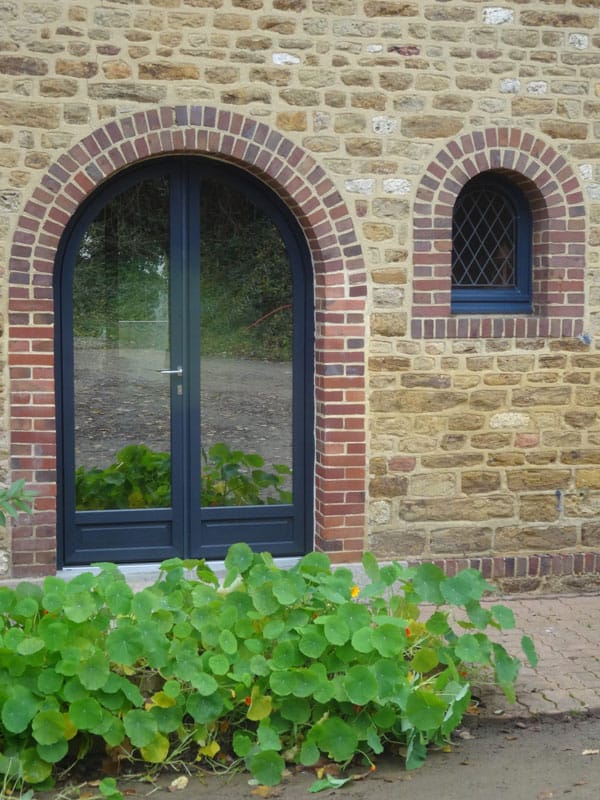 Pour cette réalisation, un petit soubassement a été réalisé permettant ainsi d’optimiser la surface vitrée et bénéficier d’une meilleure luminosité. Toutes les menuiseries sont cintrées épousant parfaitement les ouvertures de la maison.