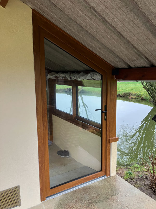 Conception, fabrication et pose d’une porte d’entrée de forme trapèze pour épousez parfaitement l’ouverture atypique de cette maison.