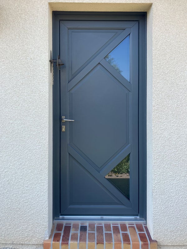 Conception, fabrication et pose d’une porte d’entrée en PVC composée d’une poignée inox et de 5 panneaux : 3 pleins et 2 vitrés permettant ainsi de légèrement laisser entrer un peu de lumière naturelle dans le logement.