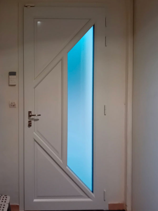 Conception, fabrication et pose d’une porte d’entrée composée de trois panneaux pleins et d’un panneau en triple vitrage dépoli permettant ainsi de laisser entrer la lumière naturelle mais pas les vis-à-vis.