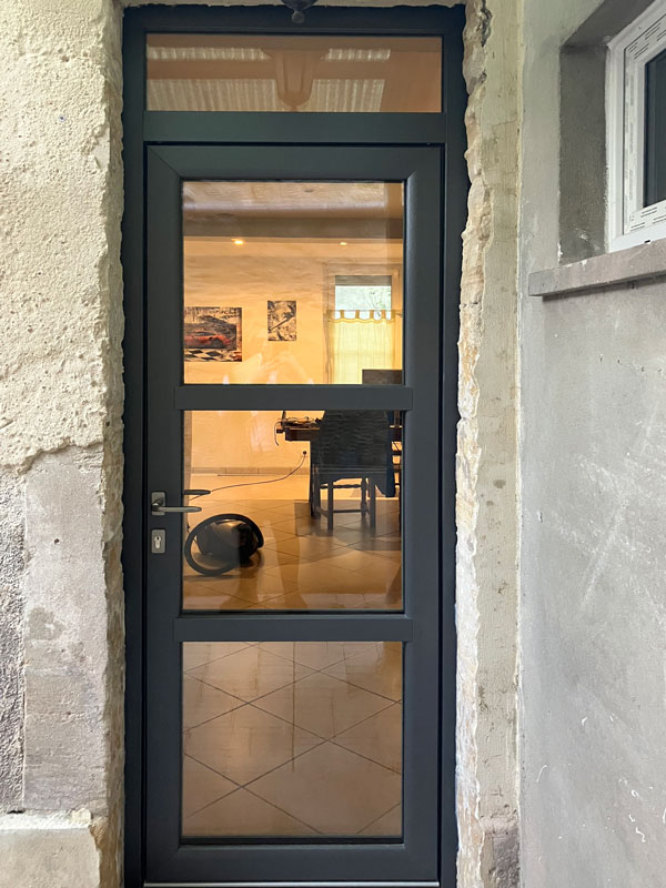 Conception, fabrication et pose d’une porte d’entrée avec imposte, composée de trois panneaux vitrés.