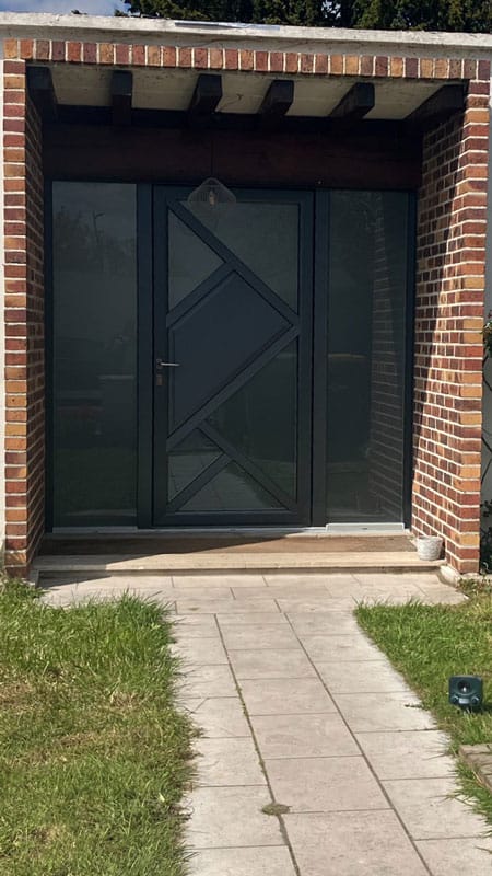 Cette porte se compose d’un ouvrant central et de deux fixes latéraux, 5 points crochets, un seuil aluminium et d’un triple vitrage dépoli.