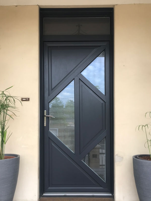 Conception, fabrication et pose d’une porte d’entrée PVC plaxé gris anthracite composée de trois panneaux pleins, trois panneaux vitrés et une imposte vitrée.