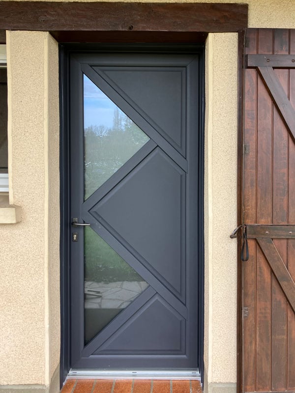 Conception, réalisation et pose d’une porte d’entrée en PVC gris anthracite à l’extérieur et imitation bois à l’intérieur. Les parties vitrées permettant de laisser entrer la lumière naturelle sont en triple vitrage dépoli. La porte se compose d’une serrure 5 points sécurité.
