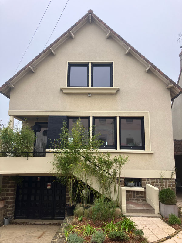 Rénovation des menuiseries de ce pavillon des années 50 avec les fenêtres PVC un vantail afin d’optimiser la surface vitrée et donc la luminosité. Un nouveau look contemporain et une isolation thermique renforcée.
