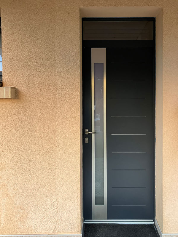 Fabrication et pose d’une porte d’entrée en PVC avec une partie vitrée et des inserts couleur inox qui viennent habiller la porte et donner un design contemporain.