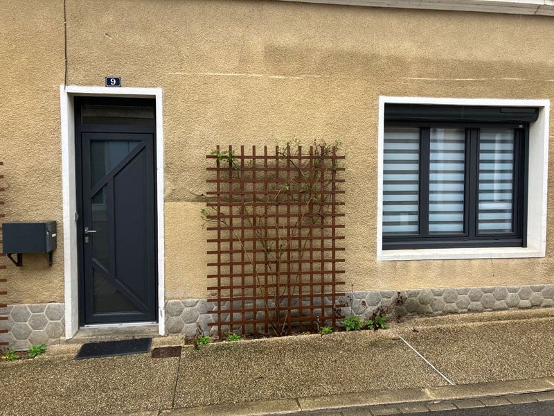 Conception, fabrication et pose d’un ensemble de menuiseries en PVC gris anthracite. Une imposte vitrée complète la porte d’entrée composée de 3 panneaux vitrés et d’un panneau plein. Quant à la fenêtre, elle est équipée d’un volet roulant solaire de la même couleur.