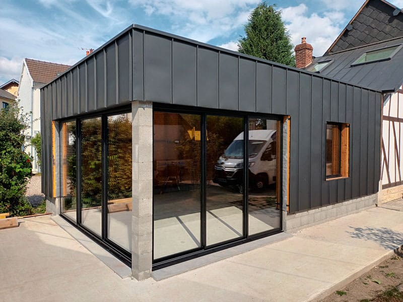Conception, fabrication et pose de deux grandes baies vitrées coulissantes sur trois rails afin de pouvoir ouvrir sur une largeur totale égale à deux vantaux.