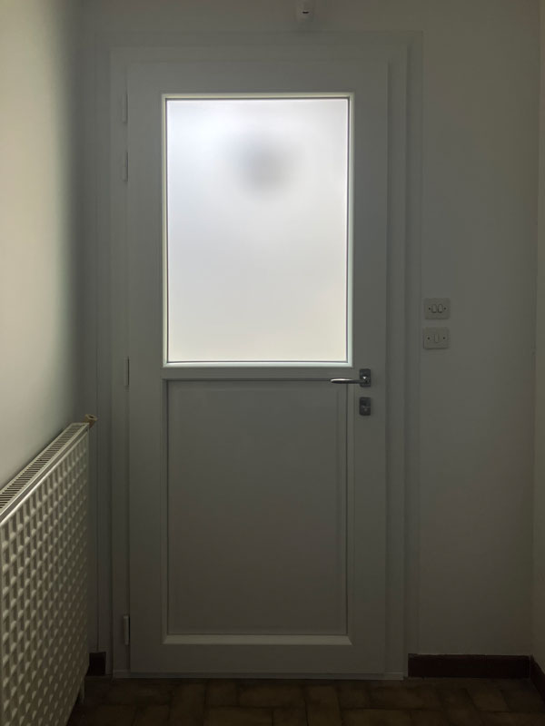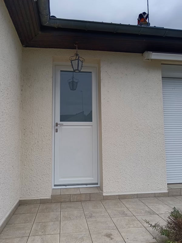 Conception, fabrication et pose d’une porte d’entrée en PVC composée en partie basse d’un panneau plein, d’un panneau avec triple vitrage dépoli en partie haute et d’une serrure 5 point.