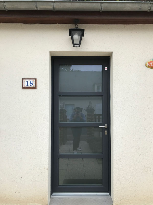 Conception, fabrication et pose d’une porte d’entrée en PVC composée de 4 panneaux en triple vitrage, d’une serrure 5 points automatiques à crochets et cylindre sécurité.