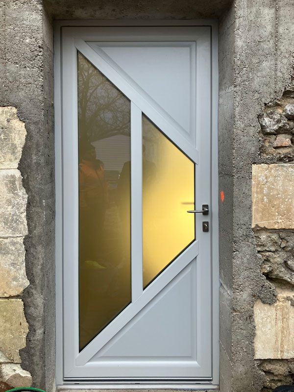Conception, fabrication et pose d’une porte d’entrée PVC composée de deux panneaux en triple vitrage dépoli permettant de laisser entrer la lumière tout en obstruant quelconque vis-à-vis.