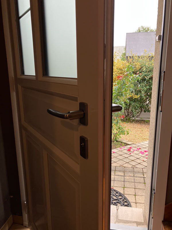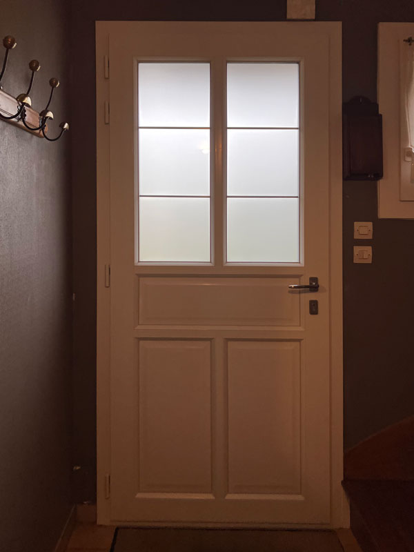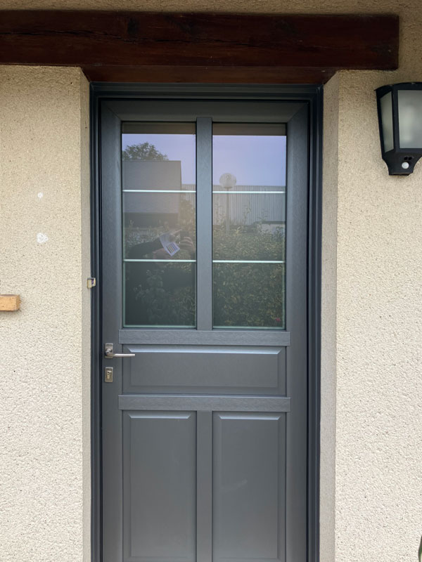 Conception, fabrication et pose d’une porte d’entrée PVC plaxée de couleur gris à l’extérieur, blanc à l’intérieur. Elle se compose d’une serrure 5 points automatiques et d’un triple vitrage dépoli avec petits bois incorporés pour une meilleure facilité d’entretien.
