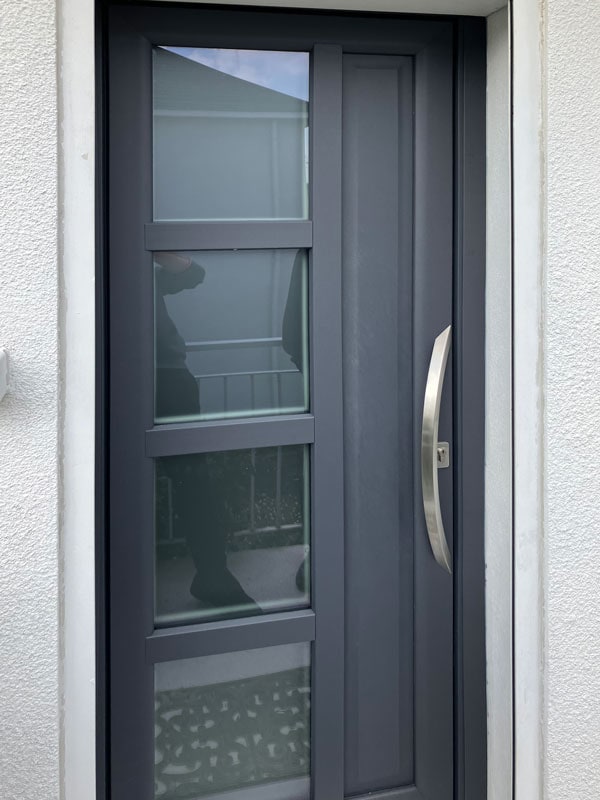 Conception, réalisation et pose d’une porte d’entrée en PVC composée d’un panneau plein et 4 panneaux triple vitrage.