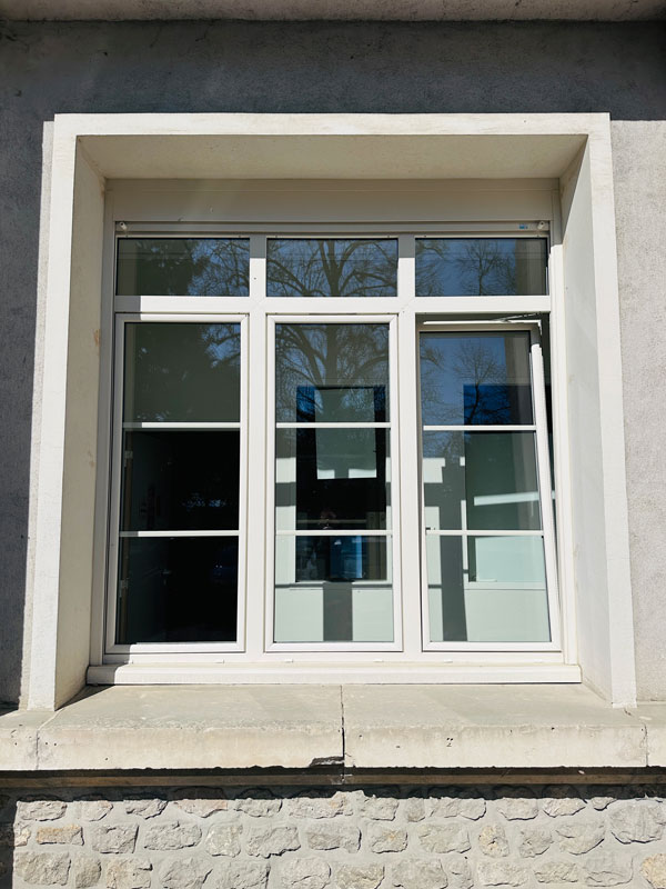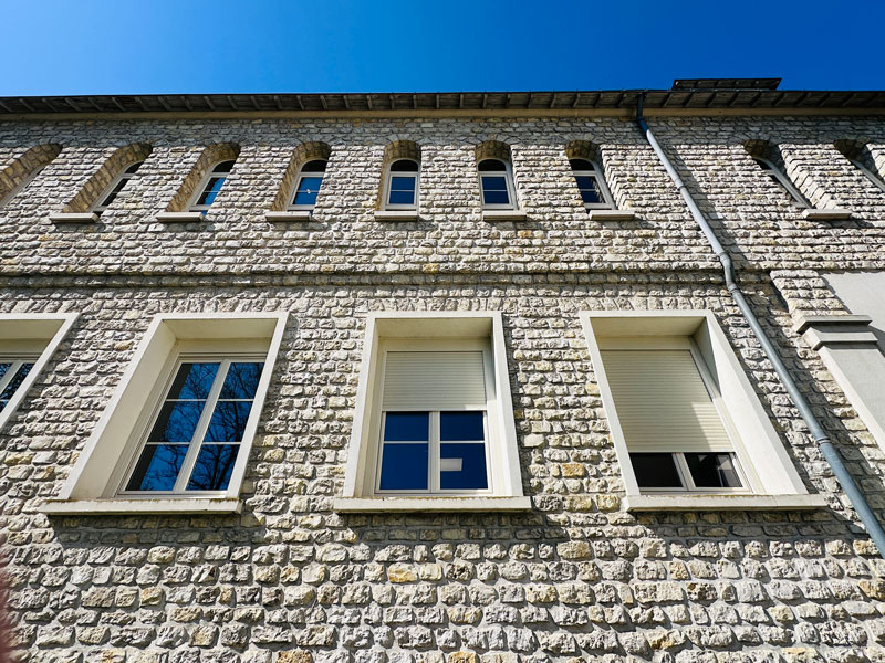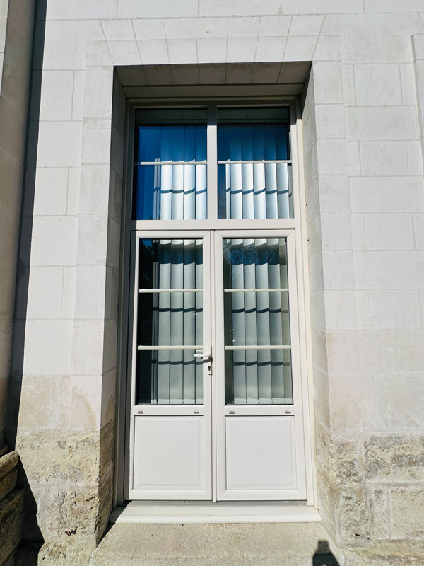 Pour la rénovation des menuiseries de cette bâtisse, nous sommes intervenus pour la conception, la fabrication et la pose de menuiseries PVC composées de double vitrage avec petits bois 28×6 intégrés de la même couleur que les châssis.