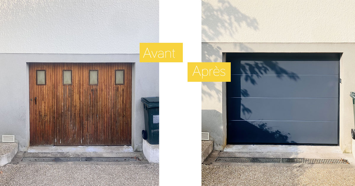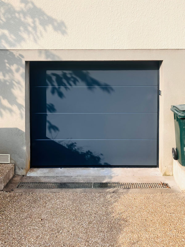 Conception et pose d’une porte de garage motorisée avec ouverture plafond composée de panneaux lisses.