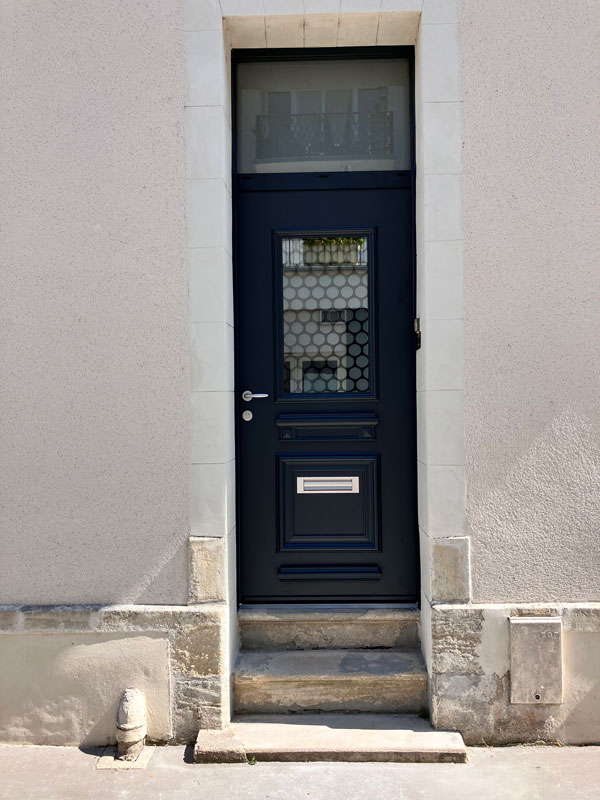 Rénovation de la porte d’entrée de cette maison avec une porte d’entrée en aluminium composée d’un triple vitrage avec grille décorative (modèle Alva), de cimaises et d’une entrée boîte aux lettres inox.