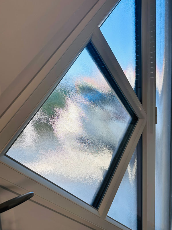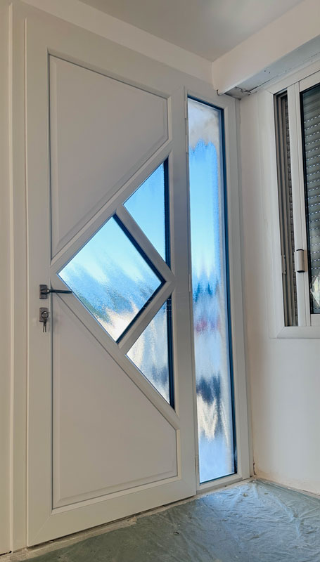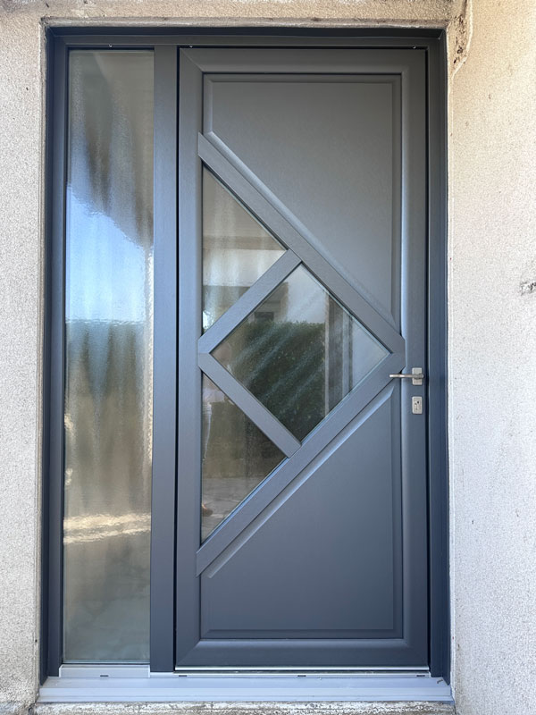 Conception, fabrication et pose d’un ensemble porte d’entrée et fixe latéral vitré. Le tout se compose d’un triple vitrage feuilleté chinchilla, un imprimé permettant de laisser entrer la lumière naturelle sans les vis-à-vis.