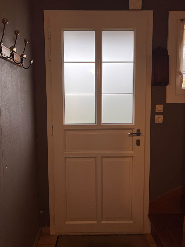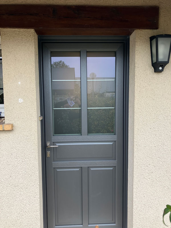 Conception, fabrication et pose d’une porte d’entrée PVC composée en partie basse d’un panneau plein, en partie haute, un triple vitrage dépoli avec croisillons intégrés et d’une serrure 5 points sécurité.